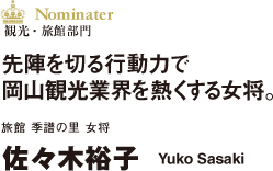 JTBアンケートで総合評価が四年間連続で県下一位に輝いた老舗旅館「季譜の里」。女将の佐々木裕子氏は、県下の温泉女将たちが、初めて団体として協力体制をとった「美作三湯女将の会」発起人であり初代から十一年間会長を務めるなど、周囲の人を動かす魅力とパワーを併せ持った女性だ。その実績から国土交通大臣賞を受賞するなど、公職においての活躍も認められている。自ら先陣を切って岡山の観光産業の振興に邁進する佐々木氏は、これからの課題をこう語る。「美作三湯の県内需要を伸ばすことがまず第一。それが全国の需要へと繋がります。そのためのアイデアと努力を怠らない姿勢も必要。そして、おもてなしの心をどれだけ多くの人が持てるか、その普及が観光産業の要になると思います。」経験を積んだ名女将の言葉。今後の活躍にますます期待が寄せられる。