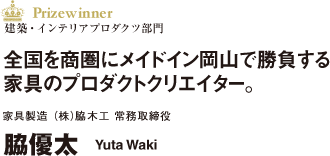 1976年生まれ、岡山県久米郡出身。(株)脇木工の常務取締役。2001年早稲田大学院理工学研究科卒。2001年東レ(株)に就職。2003年家業である(株)脇木工に入社。自社の家具ブランド「MOMO NATURAL」を立ち上げたクリエイターのひとり。
