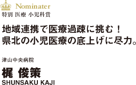 地域医療の改革が叫ばれる中、津山中央病院の新たな取り組みとして、梶俊策氏が中心となり小児救急における地域医療連携体制が二〇〇五年よりスタートした。赴任当初は小児科医二名で夜間はオンコール体制だったが、小児の夜間患者が多く小児科医による二十四時間体制を求める声が地域からも強く寄せられた。そうした中、梶氏が病院周辺の小児科、内科小児科、家庭医の医師に呼びかけ、二十四時間の小児科診療体制を作り上げたのだ。 「医療過疎地域への派遣や専門外来の拡充など県北の小児医療をより良くしたい。」と強い思いで、地域医療を牽引する。