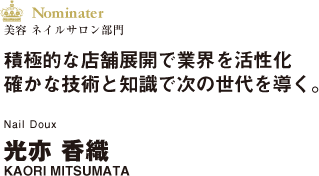 昨年に続き二回目の受賞となるネイルドゥ代表の光亦香織氏。クオリティの高い施術やネイルスクールで指導する講師として同業から高い評価を得ており、岡山のネイル業界を牽引する存在だ。そんな光亦氏は、今年七月に二店舗目となる岡山駅前店のオープンに踏み切った。景気が低迷し業界内に閉塞感が漂う中、積極的に新店をオープンさせた光亦氏の行動は、ネイル業界に活気をもたらしただけでなく、若手ネイリストへの就業機会を増やすことへ繋がっている。光亦氏は、「時代の流れを察知する感受性を持ち、新たなトレンドを発信する存在でいたいです。」と、今後の成長を誓う。