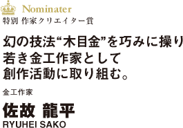 木目金(もくめがね)は、江戸時代に考案された日本独自の特殊な金属加工技術で、金属の色の違いを利用して木目状の模様を生み出す『幻の技法』と言われている。その珍しい技法を取り入れ、数多くの作品を世に生み出す佐故龍平氏。金工作家として全国からも注目される若きホープだ。難しい技術を巧みに操り、斬新な発想で作られる佐故氏の作品は、国内の工芸展で数多くの賞を受賞するなど高い評価を得ている。「自分の作りたい物が表現できる世界だからこそ『やりがい』があります。」と、自ら納得する作品を求め、佐故氏の挑戦は続いていく。
