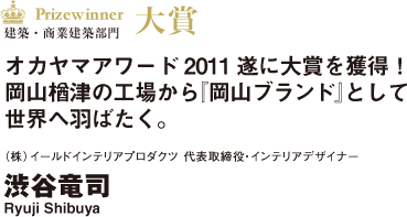 昨年開催された第一回オカヤマアワードで建築・商業建築部門を受賞した渋谷竜司氏。今年は建築・インテリアのプロダクツ部門を受賞した。そして昨年の受賞以降、受注が飛躍的に増えるなど全国的に知名度を持つブランドとなり、また多数の物件を手掛けたことが評価され遂にベスト・オブ・ザ・イヤー2011『大賞』を獲得したのだ。 渋谷氏が代表を務める『イールドインテリアプロダクツ(以下イールド)』は住宅や店舗設計、そしてインテリアデザインからリノベーションまで幅広く手掛ける空間演出のデザインプロダクト集団。岡山市楢津の自然に囲まれた山間にある自社工場から生み出される家具を中心に、素材の持ち味を活かしたデザインで全国的な注目を集めている。もともと家具製作からスタートした同社は、ソファや椅子、そしてテーブルなど暮らしの中に溶け込むプロダクトデザインで人気となり、木の質感を最大限に活かした仕上がりが魅力。「僕たちが作ったモノが空間にさり気なく存在し、そして自然とライフスタイルに溶け込んでいくことが理想です」と語る渋谷氏が提供する家具は、使えば使うほど愛着の湧いてくるモノばかり。緻密に計算された図面をもとに職人が丁寧に作り上げていくことで、手作業の暖かみを残しながら工業製品としての価値を高めているのだ。 そのデザイン力で岡山の人気店には必ずと言っていいほど同社のインテリアや空間演出が用いられており、今年飲食カフェ部門を受賞した桒原氏の『チャノマカフェ』と『マーゴカフェ』の店舗設計とインテリアデザインや旅館部門受賞の尾高氏が経営する『湯郷観光ホテル かつらぎ』のバーの椅子にもイールドのプロダクツが使用されている。また楢津にあるショールームとは別にアンテナショップを2010年から奉還町にも展開し、家具だけでなくイールドがセレクトしたインテリアグッズ、そして地元作家クリエイターの作品を積極的に取り扱うなど、同社が目指す豊かな暮らしの在り方を発信している。 「昨年のオカヤマアワードを通して受賞者同士の繋がりが生まれ、多くの知識や刺激を得ることでイールドが目指す今後の目標を明確に持てる様になってきた」渋谷氏は昨年オカヤマアワードで栄誉賞を受賞した瀬戸内市出身の世界的なインテリアデザイナー片山正通氏との交流が増えたことでも刺激を受け、今後東京などの都市圏での展開も目指していく。そして更には世界へと自分たちが作り上げたプロダクトを発信していきたいとの熱い思いで日々の製作に取り組んでいるのだ。 同社がスタートして九年が経ち、来年で十周年を迎える。当時二人から始まったイールドは現在十二人となり、イールドが目指す形を共有しながら業務に取り組んでいるのだ。その過程で各々が作り上げるモノの価値を高め、「デザインのある暮らしを選びたい」「生活の中にもっと長く使えるモノを取り入れたい」という顧客の思いを実現するために、プロダクトの質をこれからも向上させていく。そして将来的には、衣・食・住の全てに関わるインテリアをトータルコーディネートすることで利用者の感性に響く暮らしを提供し、生活を豊かにする新しい価値を見い出していきたいと夢を語る。