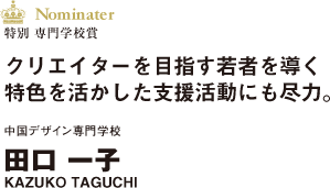 今年四月から中国デザイン専門学校の校長に就任し、クリエイターを志す若者達を支える田口一子氏。企業を巻き込んだファッションショーの開催や岡山の地場産業であるデニムにスポットを当てた『デニムジーンズ科』の新設にも尽力し、若い人材を全国から集め岡山のファッション業界に貢献している。また三月に起こった東日本大震災には就任直後から同校の特色を活かした復興支援を展開。被災地でジーンズやTシャツを配布し、その場で学生と共に裾上げやリペアも行うことで、被災者の一助となった。田口氏は、その行動力で同校学生達をそれぞれの『夢』に向かってこれからも導いていく。