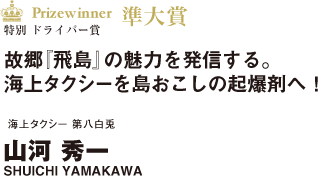 岡山県笠岡市沖にある人口百人ほどの小島『飛島』。笠岡諸島に属するその島は海上交通によって支えられている。その中で時刻表で運行する定期船とは違い、医療設備の乏しい島にとって緊急時など電話一本で二十四時間の送迎に対応する海上タクシーは、島と本土を結ぶライフラインだ。飛島出身の山河秀一氏は非常勤講師として笠岡市内の中学校で勤務していた。帰省の際に利用していた海上タクシーが廃業するという話を耳にし、かねてより島に関わる事業をしたいと考えていた山河氏は教員を辞め海上タクシーの起業を決意。家族からの反対を「生まれ故郷飛島を元気にしたい!」との強い思いで説得し、二〇一一年四月から事業をスタートさせたのだ。その行動力に島民からも厚い支持を受け、多い日には七往復以上することもある人気の海上タクシーとなっている。山河氏が起業に踏み切った背景には、飛島から若者がいなくなり急激な過疎化が進む現状を自らの手で変えていきたいとの強い思いがあったから。「飛島には誇れる自然と市街地では味わえないゆっくり落ち着いた時間を過ごせる空間がある」。教員時代、教え子達を飛島へ招待した際に空気の美味しさや綺麗な海に感動する生徒達を目にしてきた山河氏は、そんな島の魅力を海上タクシー事業を通じて来島する人々に伝えていくことで島の活性化に寄与している。また将来的には飛島で民宿や飲食店を自ら手掛け、島の魅力を発信していく拠点として観光客や定住者の増加を促進していく考えだ。 現在、海上タクシーを運行するのは山河氏を含めて7事業者。操業者の高齢化が進む中、島の重要な交通の一角を担う一人としてこれからも故郷の活性化にむけて活動していく。