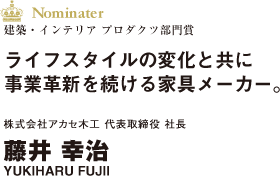 創業当初主力であった婚礼家具の需要減少に伴い、家具全般の制作にシフトし、ライフスタイルの変化と共に事業革新を続けてきたアカセ木工。ニトリの積極出店で業界が活気づく中、藤井社長は自分たちにしか作れないものを考えた。それが現在の「masterwal」である。「百年後も愛着をもてる家具」をコンセプトに、ウォールナットという素材を突き詰め、それを進化させた本物感のある高級家具。創立 周年を迎えた昨年は東京青山に出店するなど、全国を舞台にアカセ木工の飽くなき挑戦は続く。