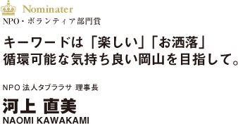 西川キャンドルナイトやリユース食器の貸出しなど、循環可能な社会・岡山を目指し、様々な手段でアプローチするNPO法人タブララサ。営利活動を最優先しないと定義付けされる『NPO』は全国的に年々その数を減らしている。河上さんは「社会の課題解決や夢・想いの実現が最優先。その対価として利益が生まれる仕組みを、NPOのみならず社会の流れとしてつくっていきたい。」と語る。個人も組織もエコで気持ち良い社会を目指すことを目標に、タブララサの活動は一人ひとりの意識に火をつけていく。