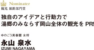 以前は、館内総責任者を任されるなどバリバリのホテルウーマンだった永山さん。そのアクティブさは結婚を機に就任した美春閣の女将になっても変わらない。2千アクセスを誇る自身のブログなどITを駆使した広報活動、自分を萌えキャラに設定した美春閣オリジナルのお土産、何より女将自らが全国を飛び回り、営業活動を行うなど超行動派である。旅館のことを考えるのはもちろんだが、湯郷という地域、ひいては岡山県全体の発展を見据え、永山さんは今日も飛び回っている。
