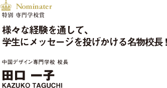 学生が将来を描けるように。この一念で学生を導くのが中国デザイン専門学校の田口校長だ。県下最大級の規模を誇るファッションショー、デニムジーンズ科の新設、震災復興支援など、取組みは様々。デザイナーとしての技術・感性はもとより、社会人として長い人生を送るための人間力を培うことを最大の教育目標とし、様々な経験を通して学生が「将来の自分」への自信を持てるようにと考えている。2015年に 周年を迎える「チュウデ」は名物校長を筆頭に更に進化を続ける。