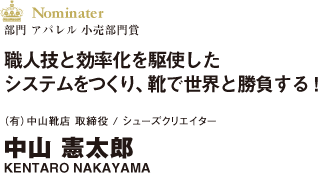 「最終的には日本で靴学校を開き、靴で世界と戦える人材を養成したい。」中山靴店の代表であり、靴職人である中山憲太郎氏は、自身の夢をそう語った。大学卒業後メキシコの工房で靴づくりの基礎を学び、帰国。日本でオーダーの靴を作っていたとき、そのお客様のほとんどは足が悪い人だったという。足を知ることの重要性を痛感した彼は、東京のドイツ人靴学校に通い、解剖学や運動生理学に基づいた靴づくりを教わった。これまでの経験と学びからインソールの重要性を知った彼は、現在も新潟の医療福祉大学で研究を重ねるなど、更なる高みを目指して研究開発を続けている。日本では融資格者の少ない、ドイツの国家資格であり、整形外科靴技術者とも呼ばれる「オートペディーシューテクニカーゲゼレ」を取得した靴のプロでもある中山氏は、靴業界の未来も見据えている。 「靴業界において切り札となるのは、オーダーメイド。靴こそ、健康面からいってもその人に合うものを作るべき。現在、靴屋の最大の悩みは、売れるか売れないか分からないものを注文し、さらに5mm刻みでサイズを揃えることによって抱える大量の在庫。効率化と職人技を駆使し、注文が入ってから靴を作るというシステムを確立できれば、街の靴屋も生き残れるかもしれない。そして、靴の本場であるヨーロッパに出店し、日本の技術とおもてなしの精神で世界と戦いたい」と話す。まだまだ靴に対する意識が希薄である、ここ日本。岡山から新たな靴文化をつくり、世界に向けて発信することが、彼の目指すところである。