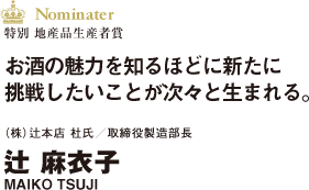 ㈱辻本店杜氏、取締役製造部長。1977年生まれ、岡山県真庭市出身。大学卒業後、辻本店に入社し酒造りを始め、2007年杜氏に就任。広島国税局清酒鑑評会“純米酒の部”優等賞、備中自醸清酒品評会で金賞を、ともに6年連続で受賞する。純米酒「GOZENSHU9(NINE)」など新しい商品を製造するとともに、地酒の普及にも取り組んでいる。