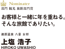 始めは乗り気ではなかったという、旅館業。西の横綱、湯原温泉砂湯を臨む旅館八景の女将、上塩浩子氏は意外な言葉を口にした。八景の始まりは、不動産業を営んでいた父親が倒産した旅館を買い取ったこと。父の頼みで経営を一任された彼女は、旧湯原グランドホテルに総務として勤務し、1996年八景の女将に就任した。元々興味も経験もなかった旅館業だったが、お客様やスタッフとの繋がりが深まり、旅館と湯原に懸ける想いが大きくなっていくにつれ、女将を楽しもうという前向きな気持ちに変わっていった。自然と調和したインテリアや従業員の温かい心配り、そして八景の真骨頂とも言える素晴らしい食事。1度は倒産した宿を見事立て直し、今や岡山屈指のリピーター率を誇り、湯原を代表する旅館の1つとなっている。 また上塩氏は、湯原地域の女将で構成された湯原温泉シャクナゲ会会長として地域福祉の活動にも積極的に取組むと同時に、地元活性化を目的とした「湯原っしい実行委員会」を発足するなど、地域や岡山観光業界のための活動も精力的に行っている。「お客様と共に年を重ね、思い出話に花を咲かせられるよう、今を精一杯頑張りたい。旅館は幸福産業。人が旅に望むワクワクする気持ちを永く大切に考えお客様と向き合っていきたい。」と女将は語る。その情熱でこれからも訪れる人をおもてなしの精神で包んでくれるだろう。