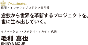 夢は、「自律する建築、自律するまち」を創造すること。イノベーション・スタジオ・オカヤマの代表であり建築デザイナーである毛利真也氏は、自身の夢をそう語った。中学生の頃から建築家を志していた彼は、17歳のときノルウェーに1年間ホームステイ。木の国といわれる和歌山に育ち、同じように自然と共生するノルウェーの生活を肌で感じたことが、現在の毛利さんのルーツになっている。大学の建築科を卒業後、実務の世界へ。設計事務所に務めているとき、日々の仕事の中でふと建築家としての自身のテーマを考えるようになる。自然素材と空間の関係性について学びたいという想い、これがきっかけとなり渡英。ロンドン、パリで実務を積み、世界的な建築家ジャン・ヌーヴェルのもとで高級メゾンのショー空間設計を手掛けるなど様々なプロジェクトに携わる。帰国後は教育活動に従事。大学の非常勤講師などを務める中で、地域の文化や産業に根付いた環境づくりや建築デザインに携わりたいという思いが芽生え、県内で行われる様々なワークショップに参加する。お互いに海外で実務経験を積み、多種多様な建築設計に関わってきたバックグラウンドを持つことや、既存環境を生かし、地域を豊かにするものを提供したいという同じ志を持つことなどから意気投合。イノベーション・スタジオ・オカヤマの設立に至った。会社設立からわずか半年にも関わらず、現在進行中、または完了したプロジェクトの数は50を超え、建築デザインのみならずビジュアル、プロダクトといった様々なデザインをトータルで提供している。また、子供向けのワークショップの開催や震災孤児の義援金「そうじゃ・宮城っ子基金」を募るイベントを行うなど、活動内容も実に幅広い。「地元の工務店や建築分野における専門家たちとの繋がりを強化することにより、信頼の置けるデザイン力と確かな技術力を掛け合わせ、岡山の住環境を革新していきたいと思っています。単に建物を造るだけではなく、その建築物が街に及ぼす影響を考えることで、地域経済や産業にからむ役割を担っていきたい。従来の建築分野の枠組を超え、デザインの可能性を広げていくことが目標です。そして何よりも自分たちのデザインによって、より快適で楽しくなるというように、ライフスタイルの質を上げるお手伝いができれば嬉しいですね。」と毛利さんは語ってくれた。その会社名に冠したように、「イノベーション=革新。物事の新結合、新しい切り口」を担う存在であり続ける。毛利氏が手掛ける、倉敷から世界を革新するプロジェクトにご期待あれ。