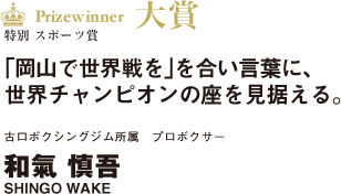 きっかけは「ケンカに勝ちたい」という単純な動機だった。今やボクシング界でも注目される選手となった「リーゼントボクサー」こと和氣慎吾。地元岡山では札付きのワルで通っていた彼が中学生のとき出会ったもの、それがボクシングだった。高校進学も危ぶまれていた少年は、その面白さに引き込まれ、毎日欠かさず練習に打ち込んだ。その姿勢と才能に魅了された周囲の人たちのサポートもあり、高校では全国区の選手に成長。そんな彼に最初の転機が訪れたのは高校3年生のインターハイでのこと。試合を見ていた古口ボクシングジムの古口会長からスカウトされたのをきっかけに、東京へ行きボクサーになるという決断をしたのだ。けれど待っていたのは過酷な現実だった。2006年にプロデビューを果たすも試合回数は少なく、ファイトマネーも微々たるもの。とてもボクシングだけで生活はできない。仕事をしながら、その合間をぬってトレーニングに打ち込むというハードな日々が続いた。そんな状態の中、一時はジムを移籍することやボクシングを辞めることまで考えたという。「周りの人たちとも上手くいかず、自分を取り巻く状況すべてに不満を抱えていました。そんな愚痴ばかりの自分に、『文句ばかりじゃ何も変わらない、現状をまず受け入れろ。』とある人が言ってくれた。その言葉をきっかけに自分を変えました。とにかく感謝の気持ちを伝えようと。すると驚くほど周りの環境が変わって、応援してくれる人が増えたんです。試合に対しても、逃げの気持ちが消えて前向きに臨めるようになって。その結果、2013年のタイトルマッチに勝利し、OPBF東洋太平洋チャンピオンにもなれたんだと思います。だからこのチャンピオンベルトは皆で掴んだものなんです。」プロボクサーとしても人間としても成長を続ける和氣選手は、そう振り返った。「相手を圧倒して勝つ」というスタイルを信条に、王者として4度の防衛に成功。現在最も世界に近い男と評される通り、自身も近い将来の目標として世界チャンピオン奪取を宣言している。さらに、今年7月には4度目の防衛戦を岡山で開催。本来であれば東京開催の方が、興行的にもメリットが大きい中、本人たっての希望ということで自らも挨拶回りやマネジメントを手掛けるなど、運営サイドとしても尽力。試合は2千人もの観客が詰めかけ大盛況で幕を閉じた。「岡山で世界戦を」を合い言葉に、岡山のみならず全国のボクシング界を盛り上げるプロボクサー。今回オカヤマアワード大賞を受賞した和氣選手の世界戦で岡山が熱狂する日は、そう遠くないだろう。